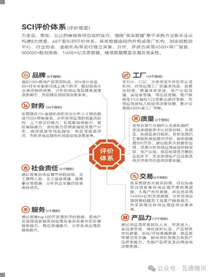 2024年,采筑供應(yīng)商綜合指數(shù)SCI全面升級:1、測評模型優(yōu)化:新增了政府平臺、國央企采購商關(guān)注的綠色工廠、綠色建材、綠色供應(yīng)鏈等測評指標(biāo);2、測評范圍擴(kuò)大:本次測評涵蓋91個品類,2600多家供應(yīng)商參評,測評的供應(yīng)商數(shù)量增加50%,測評范圍也從供應(yīng)商擴(kuò)展到與之相關(guān)的經(jīng)銷商、安裝商;3、升級并開放SCI智能測評系統(tǒng):可支持采購方自由選擇關(guān)注的指標(biāo)及算分規(guī)則,為客戶提供根據(jù)自身需求定制的評估模型,快速生成評分;4、采信范圍擴(kuò)大:采筑聯(lián)采資信標(biāo)采信SCI測評得分,更多的采購商客戶通過采信SCI測評數(shù)據(jù)進(jìn)行品牌庫建設(shè)。二、SCI三大特點:無濾鏡、無雜質(zhì)、無廣告SCI評價資料真實。測評資料來自房地產(chǎn)商、設(shè)計院、建筑單位、檢測機(jī)構(gòu)、金融機(jī)構(gòu)、供應(yīng)商、第三方數(shù)據(jù)平臺等渠道,覆蓋整個產(chǎn)業(yè)鏈。SCI基于評價模型對資料進(jìn)行比對和甄別,提升資料的真實可靠性。SCI評價數(shù)據(jù)豐富。4500多份供應(yīng)商審廠報告、50萬余份產(chǎn)品檢測報告、7500余份財務(wù)報表,200多家共建單位線上線下專項測評、上萬大眾參與投票。三、全行業(yè)強(qiáng)推,SCI勢不可擋采筑將SCI評價內(nèi)容與行業(yè)權(quán)威機(jī)構(gòu)的供應(yīng)鏈管理成果充分結(jié)合,輸出2024《采筑建材行業(yè)指南》,為行業(yè)提供一份客觀公正,能快速摸清產(chǎn)品力風(fēng)向,全方位了解供應(yīng)商實力的供采合作指導(dǎo)工具書,輔助采購商客戶準(zhǔn)確、快速決策,佐證供應(yīng)商綜合實力。